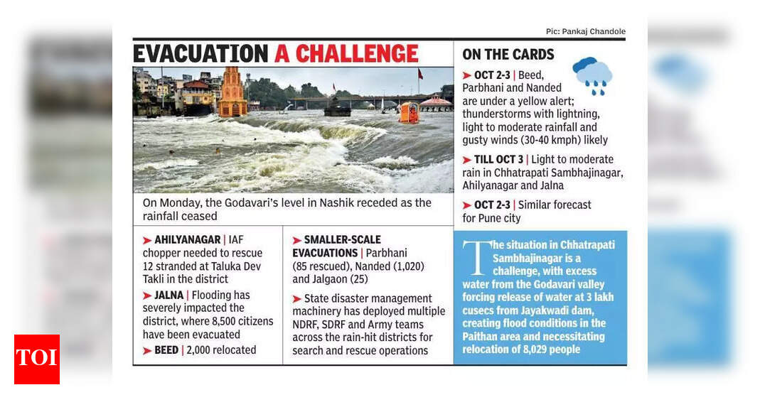 पुणे: या हंगामात कमी होण्याची चिन्हे नसल्यामुळे, आयएमडीने सोमवारी सांगितले की, यितने आणखी एक निम्न-दाब क्षेत्र बंगालच्या उपसागरावर लवकरच तयार होण्याची शक्यता आहे आणि पुढील काही दिवसांनी पिवळ्या अलर्ट अलर्ट अलर्ट अलर्ट अलर्ट अलर्ट अलर्ट अॅलर्ट अॅलेरॉन जारी केला.काही दिवसांपूर्वी विकसित केलेली आणि अलीकडील शॉवर चालविणारी एक चांगली चिन्हांकित कमी-दबाव प्रणाली कॅंबे आणि लगतच्या रीजेन्ट्स डिपार्टमेंटच्या आखातीवर कायम राहिली आहे, असे सांगितले की ही व्यवस्था सौराष्ट्र ओलांडून पश्चिमेस-वायव्येकडे सरकण्याची शक्यता आहे आणि 1 ऑक्टोबरच्या सुमारास नॉर्थस्ट अरेबियन समुद्रात उभी राहण्याची शक्यता आहे.स्वतंत्रपणे, 30 सप्टेंबर रोजी उत्तर अंदमान समुद्रावर ताजे अप्पर एअर चक्रीवादळ अभिसरण होण्याची अपेक्षा आहे, असे आयएमडीने सांगितले. त्याच्या प्रभावाखाली, 1 ऑक्टोबरच्या सुमारास बंगालच्या मध्यवर्ती उपसागरात एक नवीन लो-प्रिन्सचा विकास होण्याची शक्यता आहे, असे एजन्सीने सांगितले.पुढील काही दिवसांत महाराष्ट्रात या विभागाने महाराष्ट्रात पिवळ्या रंगाचा इशारा जारी केला आणि कोकण, गोवा आणि मध्य प्रदेश महाराष्ट्र यांच्यावर जोरदार पाऊस पडला होता. पुढील सहा दिवसांत महाराष्ट्रात 30 सप्टेंबरमध्ये, एक आयएमडीने सांगितले की, अलीकडील पाऊस पडू शकला नाही. आयएमडी सायंटिस्ट एसडी सनप म्हणाले: “2 ऑक्टोबरपासून महाराष्ट्रात पावसाची तीव्रता वाढण्याची शक्यता आहे परंतु अलीकडील स्पेलइतकेच तेवढे लक्ष असू शकत नाही – काहीजण सध्याच्या विनाशकारी पातळीशी जुळतात ज्याने राज्यभरात हजारो विस्थापित केले आहेत.”राज्य आपत्कालीन ऑपरेशन्स सेंटर (एसईओसी) छत्रपती संभाजिनगर, अहल्यानगर, जालना, बीड आणि परभानी जिल्ह्यांमधील अधिका officials ्यांशी संबंधित आहे आणि आवश्यक असल्यास हवाई समर्थन सुनिश्चित करण्यासाठी. जयकवाडी ते नांडेड पर्यंत गोदावरी नदीकाठी असलेल्या सर्व जिल्ह्यांसाठी अॅडव्हान्स पूर इशारा देखील देण्यात आला आहे. अलिकडच्या काळात पूर आला आहे.महाराष्ट्राच्या काही भागात मुसळधार पावसामुळे अलीकडेच व्यापक पूर आणि मोठ्या प्रमाणात रिकाम्या कारवाईस कारणीभूत ठरले आहे. सोलापूर जिल्ह्यात, सीना नदी वडक्बल येथे धोक्याच्या पातळीपेक्षा वर वाहत होती, तर भीमाने टाकाली येथे चेतावणी पातळीवरुन प्रवेश केला आहे, ज्यामुळे 13,724 लोकांचे स्थानांतरण आणि दोन एनडीआरएफ टीओएमएसच्या सोप्लोन्टोमेन्टची तैनाती तैनात करण्यास प्रवृत्त केले.छत्रपती संभाजिनगरमधील परिस्थिती देखील आव्हानात्मक होती, गोदावरी खो valley ्यातून जादा पाणी, जयकवाडी धरणातून 3 लाख क्यूसेक्स येथे पाथन भागात पूरच्या पूर परिस्थितीतून पाणी सोडण्