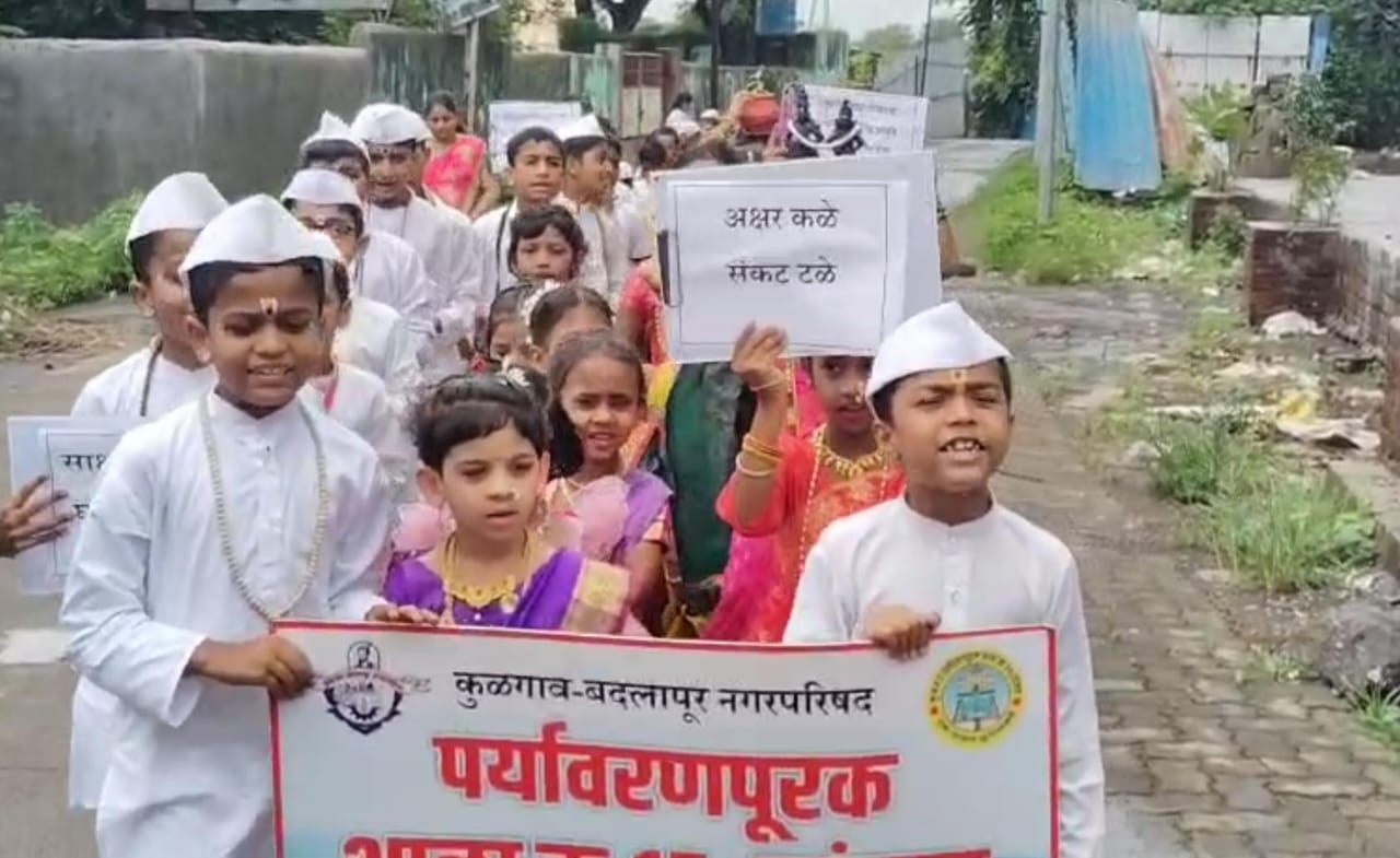 बदलापूर : येथील कुळगाव बदलापूर नगर परिषदेच्या शाळांमध्ये आषाढी एकादशीच्या पूर्वसंध्येला शनिवार दिनांक ५ जुलै २०२५ रोजी सर्व शाळांमध्ये दिंडीचे आयोजन केले होते. शाळांचा परिसर अगदी चैतनमय आणि उत्साही वातावरणामध्ये विद्यार्थी पारंपरिक वेशभूषा करून आले होते.यानिमित्ताने सर्व लहान लहान मुले विविध वेशभूषा सह तुळशीचे रोपटे घेऊन आले होते. शाळेच्या आसपासच्या परिसरामध्ये विद्यार्थीनी ही साक्षरता दिंडी काढली होती या दिंडीमधील विठोबा रखुमाई आणि वारकऱ्यांची वेशभूषा केलेल्या विद्यार्थ्यांनी उपस्थित नागरिकांचे लक्ष वेधून घेतले होते. टाळ मृदुंग. ढोल आणि साउंड वर भक्ती गीत लाऊन विद्यार्थी मनोसक्त भक्तिरसात न्हाऊन गेले होते.