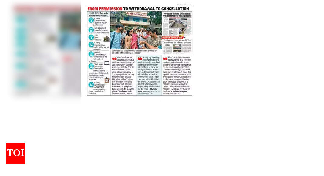 पुणे: महाराष्ट्र राज्य धर्मादाय आयुक्त अमोघ कलोती यांनी गुरुवारी मॉडेल कॉलनीतील सेठ हिराचंद नेमचंद स्मारक ट्रस्टच्या मालकीच्या 3.5 एकर मालमत्तेच्या पुनर्विकासाची 4 एप्रिल 2025 रोजीची मंजुरी रद्द करण्याचा आदेश काढला. या आदेशाने विश्वस्त आणि गोखले लँडमार्क्स एलएलपी यांना विक्री डीड आणि पॉवर ऑफ ॲटर्नी रद्द करण्याची परवानगी दिली. कलोती यांनी ट्रस्टला विक्री करार रद्द झाल्यानंतर विकासकाला 230 कोटी रुपये परत करण्याचे निर्देश दिले. जैन समुदायाने ट्रस्टच्या निर्णयावर आक्षेप घेतल्यानंतर हा करार वादात सापडला आणि दोन आठवडे आंदोलने झाली. आवारात वसतिगृह आणि जैन मंदिर/प्रार्थना हॉल आहे.करार रद्द न झाल्यास जैन धर्मगुरू आचार्य गुप्तीनंदी महाराज यांनी 1 नोव्हेंबरपासून बेमुदत उपोषणाला बसण्याच्या आवाहनादरम्यान, ट्रस्ट आणि विकासक या दोघांनीही धर्मादाय आयुक्तांना करारातून माघार घेण्याचे त्यांचे इरादे कळवले.त्यांच्या प्रतिज्ञापत्रांच्या आधारे, कलोती यांनी आदेश जारी केला, त्यांना विक्री करार रद्द करण्याची प्रक्रिया सुरू करण्याची परवानगी दिली. “महाराष्ट्र सार्वजनिक न्यास अधिनियमाच्या कलम 36 (2) अंतर्गत अधिकार वापरताना, 4 एप्रिल 2025 रोजी मंजूर केलेला आदेश याद्वारे रद्द करण्यात आला आहे,” असे आदेशात म्हटले आहे.धर्मादाय आयुक्तांनी ट्रस्ट आणि विकासकाला लवकरात लवकर विक्री डीड आणि पॉवर ऑफ ॲटर्नी रद्द करण्यासाठी पावले उचलण्यास सांगितले. ट्रस्टला विक्री मोबदल्याची संपूर्ण रक्कम विकसकाला परत करण्याचे निर्देश देण्यात आले होते, जे अंदाजे 230 कोटी रुपये आहे.आंदोलन सुरू ठेवणाऱ्या जैन समाजाच्या सदस्यांनी समाधान व्यक्त केले. माजी विद्यार्थी आणि आंदोलक अक्षय जैन यांनी TOI ला सांगितले, “हा केवळ जैन समाजाचाच नाही तर पुण्यातील लोकांचाही विजय आहे ज्यांनी आम्हाला पाठिंबा दिला. हा एक ऐतिहासिक आदेश मानला जाईल ज्यामुळे लोकांना सार्वजनिक ट्रस्टच्या जमिनीचे रक्षण करण्यात मदत होईल. हा एक कठीण लढा होता, परंतु आम्हाला आनंद आहे की न्याय मिळाला आणि आम्ही ट्रस्टची मालमत्ता वाचवू शकलो.,माजी खासदार राजू शेट्टी आणि एमव्हीए सदस्यांसह विरोधकांनी, शिवसेना पुणे युनिटचे प्रमुख रवींद्र धंगेकर यांच्यासह केंद्रीय नागरी विमान वाहतूक राज्यमंत्री आणि पुण्याचे खासदार मुरलीधर मोहोळ आणि विकासक विशाल गोखले हे व्यावसायिक भागीदार असल्याने या करारात सहभागी असल्याचा आरोप केला होता. या आठवड्याच्या सुरुवातीला मोहोळ यांनी ट्रस्टच्या वसतिगृहात आचार्य गुप्तीनंदी महाराज यांची भेट घेतली.या आदेशानंतर धर्मगुरू म्हणाले, “हा संपूर्ण समाजाच्या ऐक्याचा विजय आहे. जे काही घडले ते आता भूतकाळात आहे आणि आपण सर्