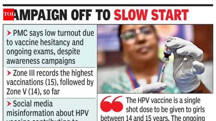 पुणे: केंद्र सरकारच्या मोफत HPV राष्ट्रीय लसीकरण मोहिमेअंतर्गत गेल्या पाच दिवसांत नागरी संस्था केवळ 44 मुलींना लसीकरण करण्यात यशस्वी ठरली, लसींचा संकोच आणि सध्याच्या परीक्षेचा हंगाम हे कमी मतदानाचे कारण आहे — अनेक जागरूकता कार्यक्रम असूनही.PMC झोन I मध्ये येरवडा-कळस-धानोरीआंदनगर रोड-वडगाव शेरारेस समाविष्ट आहेत आणि पाच मुलींना लसीकरण केल्याचे दिसले. शिवाजीनगर-शोळे रोड, औंध-बाणेर आणि कोथरूड-बावधन या झोन २ मध्ये तीन मुलींना लसीकरण करण्यात आले. धनकवडी-सहकारनगर, वारजे-कर्वेनगर आणि सिंहगड रोड प्रभाग कार्यालयाचा समावेश असलेल्या झोन III मध्ये सर्वाधिक 15 मुलींना लस टोचण्यात आले. झोन 4 मध्ये हडपसर-मुंढवा, वानोवरी-रामटेकडी आणि कोंढवा-येवलेवाडी, झोन पाचमध्ये भवानी पेठ, बिबवेवाडी आणि कसबा-विश्रामबाग वाडा या भागात सात मुलींनी 14 मुलींना लसीकरण केल्याचे दिसून आले.कोथरूड-बावधन प्रभाग कार्यालयातील वैद्यकीय अधिकारी डॉ. अंजली टिळेकर म्हणाल्या, “सोशल मीडिया ॲप्सवर फिरणाऱ्या मेसेजेसमध्ये या लसीबाबत चुकीची माहिती पसरवली गेली आहे, जी नवीन नाही आणि गेल्या 15 वर्षांपासून बाजारात आहे. ती खाजगी रुग्णालये वापरत आहेत. शिवाय, खोट्या माहितीमुळे पालक भयभीत झाले आहेत, तर अनेक मुले परीक्षेची वाट पाहत शाळेत पोहोचत आहेत. मुलींना तेच समजावून सांगणे, ज्यांची संमती आवश्यक आहे त्यांच्याशी बोलण्यासाठी आम्ही पालक-शिक्षक बैठकीची वाट पाहत आहोत.दरम्यान, आरोग्य कर्मचाऱ्यांना घटनास्थळी मुलींची नोंदणी करण्याचे प्रशिक्षण दिले जाते. दिघे म्हणाले, “ही ९० दिवसांची मोहीम आहे आणि परीक्षा संपल्यानंतर आम्हाला सकारात्मक मतदानाची आशा आहे.”