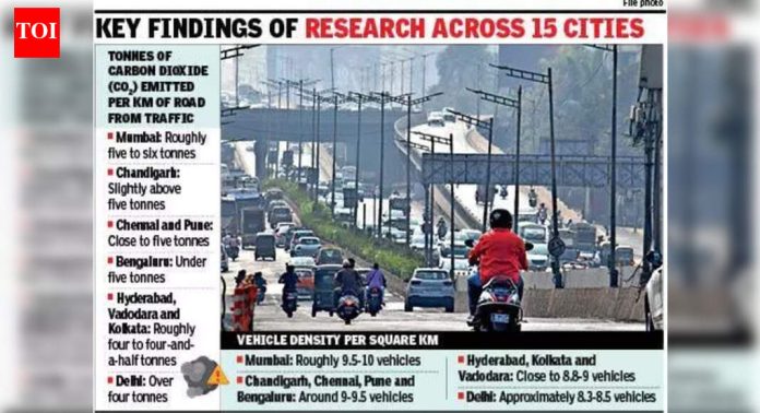 पुणे: वाहनांच्या उच्च घनतेमुळे चाललेल्या, मुंबईने प्रमुख भारतीय शहरांमध्ये प्रति किमी रस्त्याच्या लांबीच्या सर्वाधिक कार्बन डायऑक्साइड (CO₂) उत्सर्जनाची नोंद केली आहे, तर दिल्ली, बेंगळुरू, चेन्नई, हैदराबाद आणि पुणे यांसारख्या महानगरांनी देखील उच्च पातळीचे नायट्रोजन ऑक्साईड (NOx) आणि कार्बन मोनोऑक्साइड (CO) उत्सर्जन दाखवले आहे. डेटा.फ्रान्सच्या Laboratoire des Sciences du Climat et de l’Environnement आणि Université Paris-Saclay मधील संशोधकांच्या नेतृत्वाखाली हा अभ्यास, IIT Bombay आणि Paris-based Urban Mobility डेटा फर्म NEXQT SAS च्या योगदानाने, दररोजच्या रस्त्यावरील रहदारी CO₂ आणि वायू प्रदूषक उत्सर्जनासाठी भारतीय शहरांमध्ये 050-5 met 05% रिझोल्यूशनसाठी मॅप केले गेले. 2021.हा अभ्यास CHETNA प्रकल्पाचा एक भाग आहे (शहरवार उच्च-रिझोल्यूशन कार्बन उत्सर्जन ट्रॅकिंग आणि राष्ट्रव्यापी विश्लेषण), 100 हून अधिक भारतीय शहरांमध्ये उत्सर्जनाचा मागोवा घेण्यासाठी एक महत्त्वाकांक्षी उपक्रम.वाहनांची घनता आणि CO₂ उत्सर्जनाची शहरानुसार तुलना केल्यास स्पष्ट कल दिसून आला: घनदाट रहदारी असलेली शहरे प्रति किमी रस्त्यावर जास्त CO₂ उत्सर्जित करतात. विश्लेषण केलेल्या शहरांमध्ये सर्वाधिक वाहन घनता आणि प्रति किमी सर्वाधिक CO₂ उत्सर्जन या दोन्हीची नोंद करून मुंबई वेगळी ठरली. चंदीगड, चेन्नई, पुणे आणि बेंगळुरू सारखी इतर शहरे उच्च-घनता, उच्च-उत्सर्जन क्लस्टरमध्ये पडली, जरी मुंबईपेक्षा तुलनेने कमी पातळीवर. काही समान दाट शहरांपेक्षा कमी प्रति-किमी CO₂ उत्सर्जनासह, मध्य-उच्च श्रेणीत दिल्ली दिसून आली, तर गुवाहाटी, इंदूर आणि जयपूरने तुलनेने कमी रहदारी घनता आणि उत्सर्जन नोंदवले.दिल्ली प्रति किमी रस्त्याच्या उत्सर्जनासाठी मध्यम श्रेणीत असताना, रस्त्यावरील रहदारीतून एकूण CO₂ उत्सर्जनासाठी ते मुंबई आणि बेंगळुरू या तीन शहरांमध्ये सामील होते. तथापि, दरडोई उत्सर्जन वेगळी कथा सांगतात: अभ्यास केलेल्या जवळपास सर्वच 15 शहरांमध्ये प्रति व्यक्ती वार्षिक 0.2 टन CO₂ पेक्षा कमी CO₂ ची समान पातळी दर्शविते, भारतीय शहरांमधील प्रति निवासी वाहन वापराचे नमुने सुचवतात.प्रदूषक-निहाय अंदाज पुढे दर्शविले की NOx आणि CO चा सर्व शहरांमधील रस्ते वाहतूक उत्सर्जनाचा अभ्यास केला गेला. तुलनात्मक हीटमॅपने सूचित केले आहे की मुंबई, दिल्ली, बेंगळुरू, चेन्नई, हैदराबाद आणि पुणे यासह मोठ्या महानगरांनी – गुवाहाटी, मंगळुरु आणि तिरुपूर सारख्या लहान शहरांपेक्षा जास्त NOx आणि CO उत्सर्जन नोंदवले आहे.PM₁₀, PM₂.₅ सह वाहतूक-संबंधित कण प्रदूषक आणि ब्लॅक कार्बन, प्रमुख शहरांमध्ये मध्यम स्तरावर देखील उपस्थित होते, अभ्यासाच्या आकडेवारीने दर्शविले आहे परंतु NOx आणि CO पेक्षा कमी आहे.CO₂ हा हरितगृह वायू आहे. जेव्हा ते मोठ्या प्रमाणात 