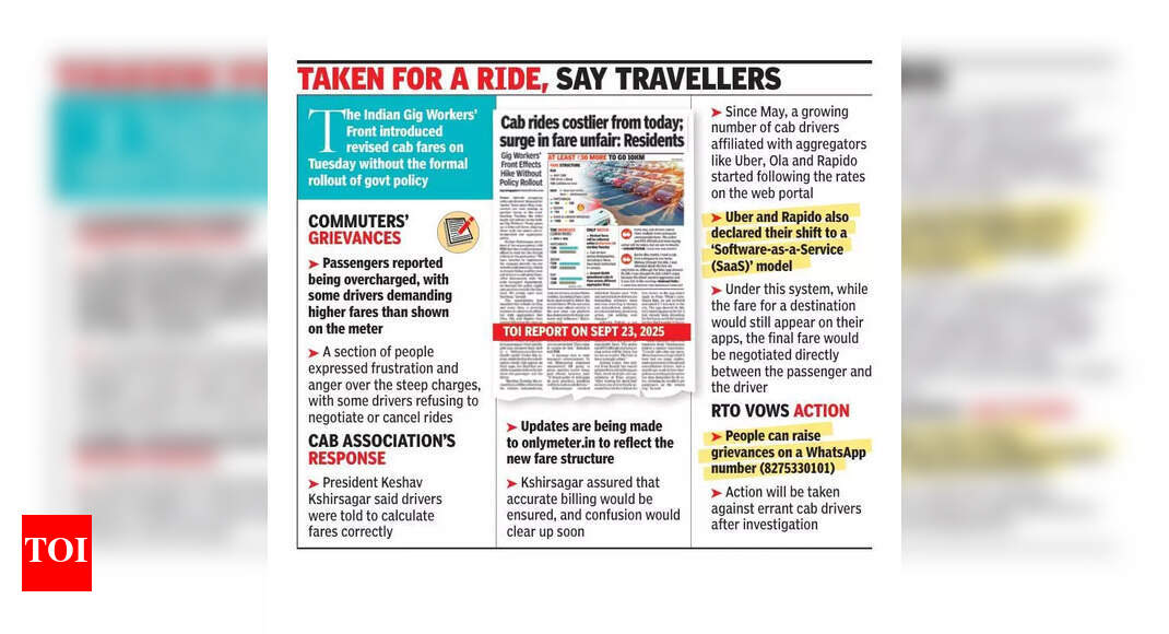 पुणे: भारतीय गिग वर्कर्सच्या आघाडीने आणलेल्या नवीन कॅब भाड्याने प्रवाशांना असंतोष निर्माण केला आणि अनेकांना गोंधळ आणि स्टिकर शॉकच्या चकमकात प्रवेश केला. उंच शुल्कामुळे हद्दपार करण्याशी तुलना केली गेली आहे, परिणामी ड्रायव्हर्स आणि प्रवाशांमध्ये ज्वलंत एक्सचेंज होते.भारतीय गिग वर्कर्स फ्रंट या कॅब असोसिएशनने मंगळवारी सुधारित भाडे उधळले आणि त्यांना राज्यातील अद्याप-बेवकूफ-नेवी असलेल्या कॅबाग्रेटर पॉलिसीशी संरेखित केले. राष्ट्राध्यक्ष केशव क्षिरसागर यांच्या नेतृत्वात असोसिएशनने मे महिन्यात भाडे मोजण्याचे व्यासपीठ एक व्यासपीठ केले होते. पॉलिसीच्या औपचारिक रोलआउटमधील विलंब झाल्यामुळे ते स्वतंत्रपणे नवीन दर स्वतंत्रपणे अंमलात आणण्याचे ठरवतात असे क्षिरसागर म्हणाले.मीटरने 8080० रुपये दाखवले असूनही, कोंडवा येथील आकाश शिंदे यांना पुणे विमानतळापासून वेडस्डे नाईटवर त्याच्या निवासस्थानी कॅब राइडसाठी 430 रुपये आकारण्यात आले. “तीन ड्रायव्हर्सने नकार दिल्यानंतर एका अंतिम सामन्यात सहमती दर्शविली परंतु भाडे सुधारित करण्यात आग्रह धरला. मी नवीन दर सत्यापित करण्याचा प्रयत्न केला, परंतु तो त्याच्या मागणीवर ठाम होता, मला पैसे देण्याशिवाय पर्याय सोडला नाही.कोरेगाव पार्क येथील विक्रम पंतलाही असाच अनुभव होता. “मला घोले रोडला 7 कि.मी.च्या प्रवासासाठी 210 रुपये देण्यास सांगण्यात आले. मी एका महिन्यापूर्वी मी १ 170० रुपयांच्या तुलनेत वाढ केली होती. भाडेवाढीची भाडेवाढ होत नाही आणि ड्रायव्हर्स बेव्हर्सची व्याख्या केली जात नाही,”कोथरुड येथील रहिवासी श्रेयस आपटे, च्युरस्डे सकाळी सुमारे k कि.मी. अंतरावर, एमजी रोडला कॅब बुक केले. “मी सेडानची निवड केली, आणि सुधारित भाडे संरचनेवर आधारित, भाड्याने अॅपमध्ये दर्शविलेल्या 10१० रुपयांच्या तुलनेत बेन सुमारे २0० आणि जुन्या मीटर दराच्या तुलनेत २१२ रुपये असावे. वाटाघाटी करण्यास नकार दिला. जेव्हा मी त्याला राइड रद्द करण्यास सांगितले, तेव्हा त्याने अंतर्भूत केले.सिंहागाद रोड येथील रहिवासी कौस्तव लाल म्हणाले की, ड्राईव्ह्स त्यांच्या स्वत: च्या गणितांच्या आधारे प्रवाशांना अनियंत्रितपणे शुल्क आकारत आहेत आणि कोणतीही प्राधिकरण कारवाई करण्यास कारणीभूत ठरत नाही. ते म्हणाले, “आरटीओ किंवा पोलिसांनाही या घटनांची माहिती आहे का? हे ओव्हर चार्जिंग आहे,” तो म्हणाला.कॅब असोसिएशनचे अध्यक्ष क्षिरसागर म्हणाले की, कॅब ड्रायव्हर्सना भाडे योग्यरित्या मोजण्यास सांगितले गेले होते आणि प्रतिबिंबित करण्यासाठी वेबसाइट (केवळ मीटर.इन) वर अद्यतने केली जात होती. ते म्हणाले, “k कि.मी. अंतर्गत सहलींसाठी, वाहनाच्या प्रकारानुसार किमान भाडे लागू होई