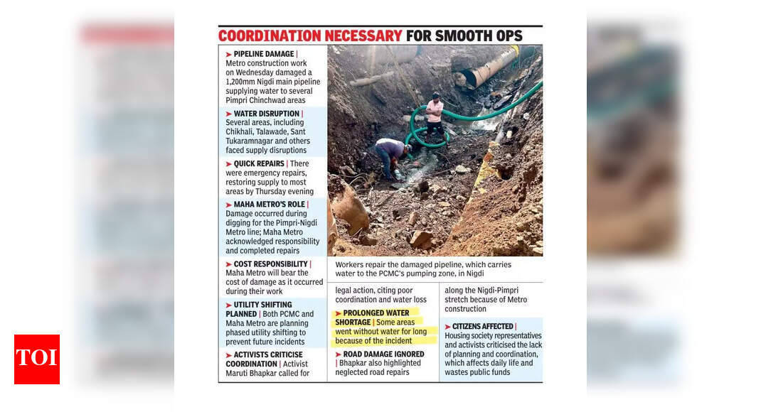 पुणे: मेट्रोने वेड्सडे नाईटवर काम केले की पिंप्री चिंटवड म्युनिसिपल कॉर्पोरेशन (पीसीएमसी) च्या पंपिंग झोनमध्ये पाणी वाहून नेणारी 1,200 मिमी निगडी मुख्य पाइपलाइन खराब झाली आणि नागरी पक्षांच्या सेप्टेडला विस्कळीत झाले. दुरुस्ती केली गेली आणि बहुतेक बाधित भागातील वितरण आणि संध्याकाळी काहीतरी पुनर्संचयित केले गेले.विघटनाचा सामना करणार्या भागात चिखली, तलावडे, नेहरुनगर, संत तुकारमनागर, महेश्नगर, कुडलवाडी, शाहुनगर, अजिंथानगर, मेहत्रे, त्रिव्हेनगर, मिहेटर, त्रिवहीगर, जडवडी आणि बोरहदडी यांचा समावेश आहे.मुख्य अभियंता आणि पीसीएमसीच्या पाणीपुरवठा विभागाचे प्रमुख प्रमोद ओम्बेसे यांनी टीओआयला सांगितले: “लग्नाच्या लग्नात पाइपलाइनचे नुकसान झाले. नागरी कर्मचार्यांची तातडीने दुरुस्ती करण्यात आली आणि जीर्णोद्धार जलदगतीने पार पाडले गेले. बहुतेक भागांना पुरवठा प्राधान्यानुसार पुनर्संचयित केला गेला. “महा मेट्रोच्या सार्वजनिक संबंधाचे अधिकारी चंद्रशेखर तांबावकर यांनी पुष्टी केली की पिंप्री-निग्डी मेट्रो लाइनच्या डर्क्स दरम्यान पाइपलाइन खराब झाली होती. “दुरुस्ती पूर्ण झाली आहे. पाण्याच्या पाइपलाइनच्या पुनर्वसनासह अनेक युटिलिटी शिफ्टिंग कामे या मार्गावर नियोजित आहेत.पीसीएमसीच्या पाणीपुरवठा विभागाच्या एका वरिष्ठ अधिका said ्याने सांगितले की मेट्रो अधिका authorities ्यांनी दुरुस्ती केली आणि त्यांच्या कामादरम्यान नुकसान झाल्यापासून हा खर्च सहन करतील. “पाइपलाइन जुनी होती आणि कामगारांना ते लक्षात आले नाही. घटना घडली.”तथापि, कार्यकर्त्यांनी दोन्ही एजन्सींमध्ये खराब समन्वय साधला आहे. त्यांनी त्याची तुलना हिंजवाडी आयटी पार्कमधील मेट्रोच्या ओव्हरलॅपिंगमुळे होणार्या अनागोंदीशी केली.कार्यकर्ते मारुती भापकर यांनी महा मेट्रोविरूद्ध कायदेशीर कारवाईची मागणी केली आहे. ते म्हणाले, “नागरी मंडळाने जबाबदार असलेल्या थॅटेस्टविरूद्ध एफआयआर दाखल करावा. अरेरे, पुरवठा वैकल्पिक दिवसांवर आहे. गुरुवारी मोहनानगर, कालभोर्नगर आणि महात्मा फ्लेनगर यासारख्या भागात पुरवठा करण्यात आला. तेथील रहिवाशांना तीन दिवस सतत पाण्याशिवाय जावे लागले.,भापकर म्हणाले की, महा मेट्रो निगडी-पिंप्री स्ट्रेचवरील रस्त्याच्या दुरुस्तीची कामे करण्यासही अपयशी ठरले होते, जे चालू असलेल्या कामांमुळे नुकसान झाले. ते म्हणाले, “पावसाळ्याच्या वेळी रस्त्याच्या स्थितीत काम केल्यामुळे नियमित प्रवासी आणि सामान्य लोकांना त्रास सहन करावा लागतो आणि दुरुस्तीचे कोणतेही काम संपुष्टात आणले जात नाही,” असे ते पुढे म्हणाले.पिंप्री चिंचवद सहकारी गृहनिर्माण सोसायटीस फेडरेशनचे अध्यक्ष दट्टाट्रे देशमुख म्हणा