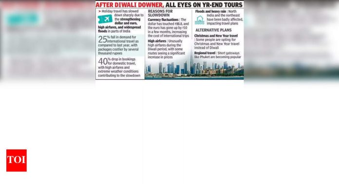 पुणे: सुट्टीच्या प्रवासाने या दिवाळीने झपाट्याने धीमे केली आहे. परदेशात आणि घरगुती बुकिंगने डॉलर आणि युरोला बळकटी दिली आणि भारताच्या मोठ्या विमान आणि व्यापक पूरांसह दोन्ही फटका बसला. ट्रॅव्हल एजंट्सच्या मते, आंतरराष्ट्रीय पॅकेजेस कित्येक हजारो रुपयांनी महागड्या आहेत आणि गेल्या वर्षाच्या तुलनेत सुमारे 25% मागणी कमी झाली आहे, तर घरगुती प्रवासात 40% घट झाली आहे. “एकंदरीत, बुकिंग ही दिवाळी धीमे आहे. चलन हे एक मोठे कारण आहे. डॉलरने .8 88..8 रुपयांना स्पर्श केला आहे, युरो काही महिन्यांत दहाव्या क्रमांकावर आहे. पुजारी म्हणाले की, वर्षाच्या सुरुवातीच्या काळात 4.15 लाख रुपये खर्च झालेल्या युरोपच्या पॅकेजमध्ये आता चलनात चढउतारांमुळे 7.5 लाख रुपये आहेत. ते म्हणाले, “दुबईची सहल सुमारे १ लाख रुपये होती, ती प्रत्येक व्यक्तीस rs००० रुपयांवर गेली आहे. केवळ सिंगापूर डॉलरदेखील ते rs 64 रुपयांवरून rs Rs रुपयांवर गेले आहेत,” तो म्हणाला.दिवाळीच्या कालावधीत असामान्यपणे उच्च हवाईफेरांनी मंदीमध्ये भर घातली आहे. “6,000 ते, 000,००० रुपयांचे एक-मार्ग पुणे-कोचिनचे तिकिट आता १,000,००० रुपये ते १,000,००० रुपये आहे.” घरगुती प्रवासालाही अत्यंत हवामानाचा फटका बसला आहे. ते म्हणाले, “हिमाचल आणि उत्तराखंडमध्ये पूर आणि मुसळधार पावसामुळे उत्तर भारताचा वाईट परिणाम झाला आहे. गँगटोकसह ईशान्य दिशेलाही भारताच्या भारताच्या भागातील भागांचा त्रास सहन करावा लागला आहे, म्हणून लोक तेथे प्रवास करण्याची योजना आखत नाहीत,” ते म्हणाले. मंदी असूनही, काही गंतव्ये लवचिक राहतात. “व्हिएतनाम या दिवाळीच्या यादीमध्ये अव्वल स्थान मिळवत आहे कारण विमानफेअर्स स्वस्त आहेत आणि ते तुलनेने परवडणारे आहेत. बाली आणि दुबई यांनाही मागणी आहे, असा विचार केला आहे की दुबई महागड्या आहेत. पर्यटन मजबूत आहे – कुंभानंतरही वाराणसी आणि अयोोध्या यांना जास्त मागणी आहे.”ओडिसी टूर्स अँड ट्रॅव्हल्सचे मुख्य कार्यकारी अधिकारी निखिल ठाकुरद म्हणाले: “यावर्षी दिवाळीचा प्रवास निश्चितच कमी आहे. परंतु मुख्य कारणांपैकी एक म्हणजे लोक त्याऐवजी ख्रिसमस आणि नवीन वर्षाच्या प्रवासाची निवड करीत आहेत. गेल्या काही वर्षांत, आम्ही एक स्पष्ट ट्रेंड पाहिला आहे जिथे कुटुंब दिवाळी आणि डीईसी सुट्टीच्या दरम्यान निवडतात आणि यावेळी ख्रिसमस जिंकलेला दिसत आहे. “ते पुढे म्हणाले, “जेव्हा एनआरआयएस डीईसीमध्ये घरी येतो, तेव्हा कुटुंबांना फक्त पुणे किंवा मुंबई येथे घरी बसण्याची इच्छा नसते-बहु-पिढ्यांच्या सुट्टी एकत्र एकत्र. दिवाळी, जी आपल्या स्वत: च्या शहरात कुटुंबासमवेत परत राहण्याबद्दल अधिक बनली आहे.”“यावर्षी दिवाळी ऑक्टोबरच्या तिस third ्या आठवड्यातही थोड्या लवकर आली आहे. ऑक्टो