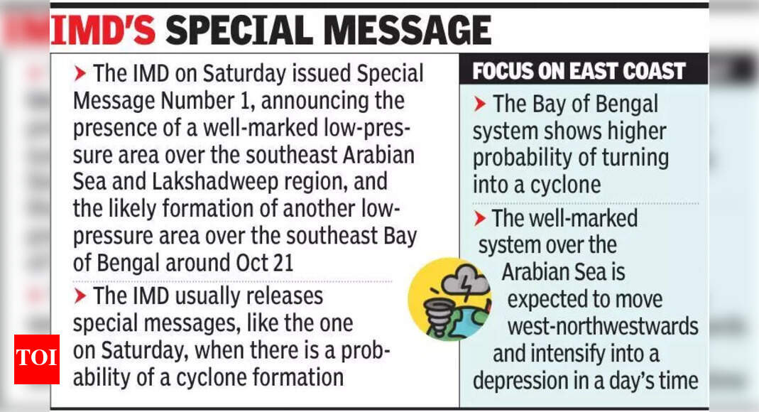 पुणे: आयएमडीने शनिवारी आग्नेय अरबी समुद्र आणि लक्षद्वीप प्रदेशात कमी दाबाच्या क्षेत्राची उपस्थिती जाहीर केली आणि 21 ऑक्टोबरच्या सुमारास आग्नेय बंगालच्या उपसागरात आणखी एक कमी दाबाचे क्षेत्र तयार होण्याची शक्यता आहे, ज्यामुळे चक्रीवादळात रूपांतर होण्याची अधिक शक्यता आहे. भारतीय हवामान विभागाच्या (IMD) विशेष संदेश क्रमांक 1 नुसार, शनिवारी पहाटे अरबी समुद्रावर ही प्रणाली तयार झाली. सु-चिन्हांकित प्रणाली पश्चिम-वायव्य दिशेकडे सरकणे आणि एका दिवसाच्या कालावधीत नैराश्यात तीव्र होण्याची अपेक्षा आहे. येत्या तीन दिवसांत बंगालच्या उपसागरात दुसरी प्रणाली तयार होण्याची शक्यता आहे. दक्षिण बंगालच्या उपसागराच्या मध्यवर्ती भागांवर आणि उपसागराच्या लगतच्या पश्चिम-मध्य भागांवर ते लवकरच दाबाच्या रूपात मजबूत होऊ शकते. आयएमडीने अद्याप चक्रीवादळ होण्याची शक्यता दर्शविली नसली तरी, स्वतंत्र हवामान तज्ञांनी सुचवले की दोन्ही प्रणालींमध्ये चक्रीवादळांमध्ये आणखी तीव्र होण्याची क्षमता आहे. जेव्हा चक्रीवादळ निर्माण होण्याची शक्यता असते तेव्हा IMD सहसा विशेष संदेश जारी करते, जसे की शनिवारी. आयएमडीच्या एका वरिष्ठ अधिकाऱ्याने सांगितले की, “अरबी समुद्रात चक्रीवादळ होण्याची शक्यता दिसत नाही, जरी आम्ही कमी दाबाची शक्यता दर्शविली आहे आणि त्याची तीव्रता लवकरच नैराश्यात बदलू शकते. बंगालच्या उपसागरातील प्रणालीचे नैराश्यात रूपांतर होऊ शकते. रविवारपर्यंत, आपल्याकडे अधिक स्पष्टता असणे आवश्यक आहे. बंगालच्या उपसागरात चक्रीवादळात रूपांतर होण्याची उच्च शक्यता आहे.”स्कायमेट वेदर सर्व्हिसेसचे अध्यक्ष जीपी शर्मा म्हणाले, “बंगालच्या उपसागराची प्रणाली अरबी समुद्र प्रणालीपेक्षा अधिक मजबूत असण्याची शक्यता आहे. केरळ आणि किनारपट्टीवरील कर्नाटकात पाऊस पडण्याशिवाय उत्तरार्धाचा आपल्या किनारपट्टीवर फारसा परिणाम होणार नाही. दुसरीकडे बंगालच्या उपसागराची प्रणाली अधिक शक्तिशाली होण्याची शक्यता आहे आणि ती तामिळनाडूच्या किनाऱ्याकडे सरकण्याची शक्यता आहे. उपसागर प्रणालीचा आपल्या क्षेत्रावर अधिक परिणाम होऊ शकतो आणि ती वेगाने तीव्र होण्याची शक्यता आहे. सहसा, त्या अक्षांशावरील अशा प्रणालींचा दक्षिणेकडील द्वीपकल्प ओलांडून अरबी समुद्राकडे जाण्याचा इतिहास असतो आणि शेवटी ते गुजरातच्या किनाऱ्याकडे जाऊ शकतात. आत्तापर्यंत, हे प्रारंभिक संकेत आहेत.”स्कायमेट वेदर सर्व्हिसेसच्या आणखी एका अधिकाऱ्याने सांगितले की, “अरबी समुद्रावरील नैराश्य भारताच्या किनाऱ्यापासून दूर वायव्येकडे सरकेल, परंतु लक्षद्वीप आणि केरळमध्ये एकाकी मुसळधार पाऊस पाडू शकेल. बंगालच्या उपसागराची प्रणाली 23 