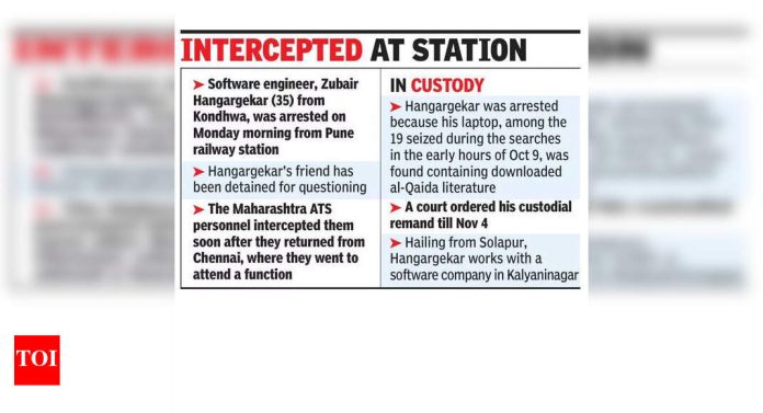 पुणे : महाराष्ट्र दहशतवाद विरोधी पथकाने (एटीएस) सोमवारी सकाळी कोंढवा येथून जुबेर हंगरगेकर (३५) या सॉफ्टवेअर अभियंत्याला प्रतिबंधित दहशतवादाचे साहित्य बाळगल्याच्या आरोपावरून अटक केली. संघटना, अल-कायदा. दोघे चेन्नईहून परतल्यानंतर एटीएसने हंगरगेकर यांच्या मित्राला पुणे रेल्वे स्थानकावर चौकशीसाठी ताब्यात घेतले. ते एका कार्यक्रमात सहभागी होण्यासाठी गेले होते.“आम्ही हंगरगेकरला अटक केली कारण 9 ऑक्टोबरच्या पहाटे जप्त केलेल्या 19 लॅपटॉपपैकी त्याच्या लॅपटॉपमध्ये अल-कायदाचे डाउनलोड केलेले साहित्य सापडले. असे साहित्य डाउनलोड करणे हा गुन्हा आहे,” असे एटीएस अधिकाऱ्याने नाव जाहीर न करण्याच्या इच्छेने TOI ला सांगितले.19 लॅपटॉप व्यतिरिक्त, एटीएसने 9 ऑक्टोबर रोजी शहरातील अनेक ठिकाणी केलेल्या झडतीदरम्यान 40 सेलफोन जप्त केले होते. ही गॅजेट्स डिजिटल फॉरेन्सिक विश्लेषणासाठी पाठवण्यात आली होती, असे अधिकाऱ्याने सांगितले. एटीएसच्या पथकाने सोमवारी सायंकाळी हंगरगेकर यांना शहर न्यायालयात हजर केले. त्याला ४ नोव्हेंबरपर्यंत कोठडीत ठेवण्याचे आदेश दिले आहेत. अधिकाऱ्याने सांगितले की, हंगरगेकर यांनी अभियांत्रिकी पदवी घेतली आहे आणि ते सॉफ्टवेअर चाचणी आणि डेटाबेस डेव्हलपमेंटमध्ये होते. मूळचे सोलापूरचे असलेले हंगरगेकर हे कल्याणीनगर येथील एका सॉफ्टवेअर कंपनीत कामाला आहेत. तो विवाहित असून त्याला दोन मुले आहेत. त्याचा भाऊ आणि कुटुंबातील इतर सदस्य जवळच्याच सोसायटीत राहतात.“आम्ही हंगरगेकर अल-कायदाच्या सदस्यांच्या संपर्कात आला होता का आणि त्याच्याशी काय संबंध ठेवायचा होता याचा तपास करत आहोत. तसेच, त्याच्याकडे अल-कायदाचे सर्व साहित्य का होते. आम्ही त्याच्या ताब्यात घेतलेल्या मित्राची चौकशी करू आणि त्याचा सेलफोन आणि इतर इलेक्ट्रॉनिक गॅझेट तपासू. तो इतर कोणत्याही दहशतवादी संघटनेच्या संपर्कात आला आहे का, हेही आम्ही तपासत आहोत, असे एटीएसच्या वरिष्ठ अधिकाऱ्याने सांगितले.एटीएसने या महिन्याच्या सुरुवातीला मागील ISIS मॉड्यूल प्रकरणाच्या चालू तपासाच्या संदर्भात शोध घेतला आणि ते संशयित कट्टरपंथी लोकांवर केंद्रित होते. त्यावेळी १९ जणांना ताब्यात घेण्यात आले. चौकशीनंतर त्यांना सोडून देण्यात आले. अधिकाऱ्यांनी इलेक्ट्रॉनिक गॅझेट्सशिवाय कागदपत्रे जप्त केली.
