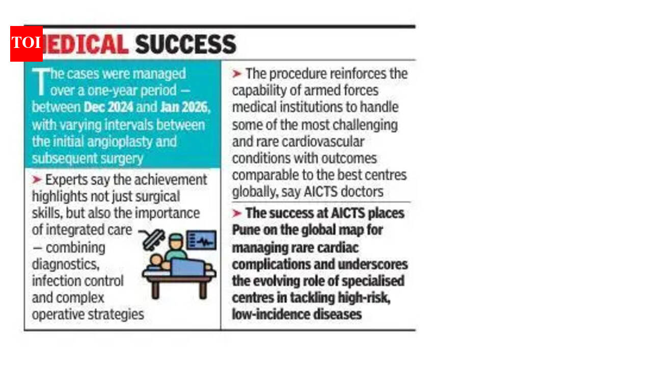पुणे: आर्मी इन्स्टिट्यूट ऑफ कार्डिओथोरॅसिक सायन्सेस (एआयसीटीएस) च्या डॉक्टरांच्या चमूने कोरोनरी स्टेंट संसर्ग नावाच्या अपवादात्मकपणे असामान्य आणि जीवघेण्या स्थितीने ग्रस्त असलेल्या चार रुग्णांवर यशस्वी उपचार केले ज्यातील 50 पेक्षा कमी प्रकरणे जागतिक स्तरावर नोंदवली गेली आहेत.या स्थितीला वैद्यकीयदृष्ट्या पोस्ट-पर्क्यूटेनियस कोरोनरी इंटरव्हेंशन, कोरोनरी आर्टरी एन्युरिझम किंवा कोरोनरी स्टेंट इन्फेक्शन असे म्हणतात. हे उच्च मृत्युदराशी संबंधित आहे आणि ते दुर्मिळ आहे कारण ते फारसे समजत नाही. प्रगत व्यवस्थापनासाठी एआयसीटीएसकडे पाठवण्यापूर्वी चार रुग्णांवर सुरुवातीला वेगवेगळ्या नागरी आणि खाजगी रुग्णालयांमध्ये अँजिओप्लास्टी प्रक्रिया पार पडली होती.प्रत्येक केसने अद्वितीय शस्त्रक्रिया आव्हाने सादर केली ज्यासाठी डिसेंबर 2024 ते जानेवारी दरम्यान काळजीपूर्वक नियोजन आणि अंमलबजावणी आवश्यक होती, असे डॉक्टरांनी सांगितले. AICTS मधील एका वरिष्ठ कार्डिओथोरॅसिक सर्जनने TOI ला सांगितले: “” ही गुंतागुंत अत्यंत दुर्मिळ आणि संभाव्य प्राणघातक आहे. जागतिक स्तरावर, पुरावे वेगळ्या केस रिपोर्ट्स आणि छोट्या मालिकांपुरते मर्यादित आहेत. अगदी एक केस व्यवस्थापित करणे ही मागणी आहे, चार यशस्वीरित्या उपचार करणे महत्त्वपूर्ण होते. ते सर्व बरे झाले आहेत.”सर्जिकल पध्दतीमध्ये संक्रमित कोरोनरी स्टेंट एन्युरिझम काढणे किंवा वगळणे, त्यानंतर रक्त प्रवाह पुनर्संचयित करण्यासाठी प्रभावित भागाच्या पलीकडे कोरोनरी आर्टरी बायपास ग्राफ्टिंगचा समावेश होतो. जटिलतेनुसार प्रक्रिया साडेतीन ते पाच तास चालली.वैद्यकीय साहित्यानुसार, कोरोनरी स्टेंट संसर्गामुळे मृत्यू दर 40% पर्यंत असतो, विशेषतः जेव्हा निदान किंवा हस्तक्षेपास विलंब होतो. स्थितीची दुर्मिळता अनेकदा कमी ओळखण्यास कारणीभूत ठरते, अचानक हृदयविकाराच्या मृत्यूसह गंभीर गुंतागुंत होण्याचा धोका वाढतो.बीजे वैद्यकीय महाविद्यालयातील हृदय शस्त्रक्रिया विभागाचे माजी प्रमुख अविनाश इनामदार यांनी TOI ला सांगितले: “अशी प्रकरणे दुर्मिळ आहेत. त्यावर उपचार केले जाऊ शकतात ही वस्तुस्थिती एक मोठी सकारात्मक आहे. यापूर्वी असे एक-दोन रुग्ण सल्ला घेण्यासाठी आमच्याकडे आले होते. तथापि, AICTS च्या यशामुळे मानक कार्यपद्धती प्रदान करण्यात मदत होऊ शकते, जी खाजगी रुग्णालयांसाठी देखील उपयुक्त ठरेल. भारतातील हृदयरोग तज्ञांसाठी हे वरदान आहे.”“लवकर निदान गंभीर आहे. स्टेंट ठेवल्याच्या काही दिवसात संसर्ग होऊ शकतो. आमच्या चार रुग्णांमध्ये एक दिवसापासून ते सुमारे दोन आठवड्यांपर्यंत संसर्ग होऊ शकतो,” असे उपचाराशी निगडित आणखी एका डॉक्टरने सांगित