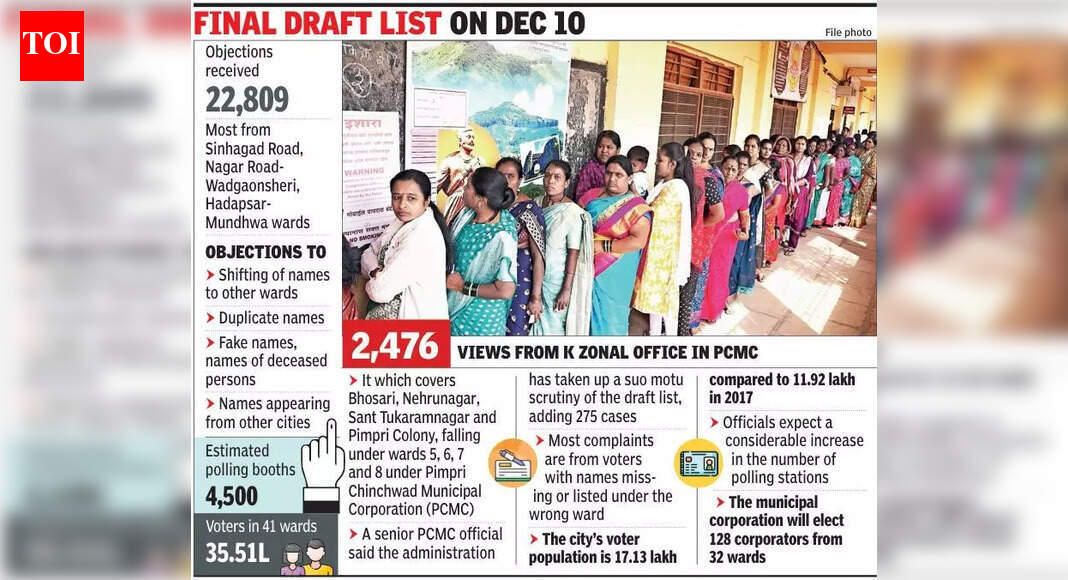 प्रभागनिहाय मतदार यादीवर हरकती नोंदवण्याची मुदत बुधवारी संपली आणि एकूण हरकतींची संख्या २२,८०९ झाली. त्यापैकी शेवटच्या दिवशी ९ हजार ८६३ हरकती आल्या. नागरी प्रशासनाने पुढील आठवड्यात दुरुस्त्या सुरू करायच्या आहेत आणि 10 डिसेंबरपर्यंत मतदार याद्यांचा अंतिम मसुदा प्रसिद्ध करायचा आहे.सिंहगड रोड वॉर्ड ऑफिसला शेवटच्या दिवशी 6,308 हरकती प्राप्त झाल्या, सर्व वॉर्डांमध्ये सर्वाधिक, त्यानंतर नगर रोड-वडगाव शेरी वॉर्ड (5,617), धनकवडी-सहकारनगर वॉर्ड (2,472), आणि हडपसर-मुंढवा वॉर्ड ऑफिस (2,186) आहेत. नागरीकांच्या तक्रारी स्वीकारण्यासाठी नागरी प्रशासनाने सर्व प्रभाग कार्यालयांमध्ये समर्पित डेस्क उभारले आहेत. पीएमसीच्या निवडणूक विभागाचे प्रमुख प्रसाद काटकर म्हणाले की, प्रशासनाने या हरकतींची छाननी सुरू केली आहे.शहरातील राजकीय वर्तुळातील सूत्रांनी सांगितले की, विविध भागातील राजकीय कार्यकर्ते आणि इच्छुकांनी आपापल्या परिसरात व्यापक प्रचार मोहीम राबवून नागरिकांना मतदार यादीत नावे तपासण्याचे आवाहन केले. नर्हे भागातील एका इच्छुकाने सांगितले की, “आम्ही वैयक्तिकरित्या मतदारांशी विसंगती तपासण्यासाठी संपर्क साधला आणि त्यांना ताबडतोब प्रशासनाकडे आक्षेप नोंदविण्याचे आवाहन केले.”नारायण पेठ भागातील एका माजी नगरसेवकाने मतदारांना त्यांचे तपशील मतदार यादीत तपासता यावेत यासाठी एक डेस्क उभारला, तर शिवाजीनगर भागातील एका माजी नगरसेवकाने सांगितले की, नावे बदलण्याच्या तक्रारींची दखल घेण्यासाठी त्यांनी नागरी प्रशासन आणि निवडणूक आयोगाकडे तक्रारी केल्या. काँग्रेस नेते आणि माजी नगरसेवक अविनाश बागवे म्हणाले, “आम्हाला दोन समस्या लक्षात आल्या आहेत. अनेक नावे अचानक इतर प्रभागात हलवण्यात आली आहेत आणि त्यात डुप्लिकेट नावांची संख्याही लक्षणीय आहे. प्रशासनाने दोन्ही समस्यांवर काम करून त्रुटीमुक्त मतदार याद्या तयार केल्या पाहिजेत.दरम्यान, पुण्यातील प्रभागनिहाय मतदार यादीत इतर शहरातील नावे आल्याचा आरोप काही इच्छुकांनी केला आहे. आम आदमी पक्षाचे शहर नेते धनंजय बेनकर म्हणाले की, त्यांच्या पक्षाने मतदानाच्या दिवसापूर्वी सर्व त्रुटी दूर करण्यासाठी राज्य निवडणूक आयोगाला पत्र लिहिले आहे.दरम्यान, पिंपरी चिंचवड महानगरपालिकेला (पीसीएमसी) सर्व नऊ विभागीय कार्यालये आणि नागरी मुख्यालयातील प्रारूप मतदार यादीसाठी 10,288 सूचना आणि हरकती प्राप्त झाल्या आहेत.