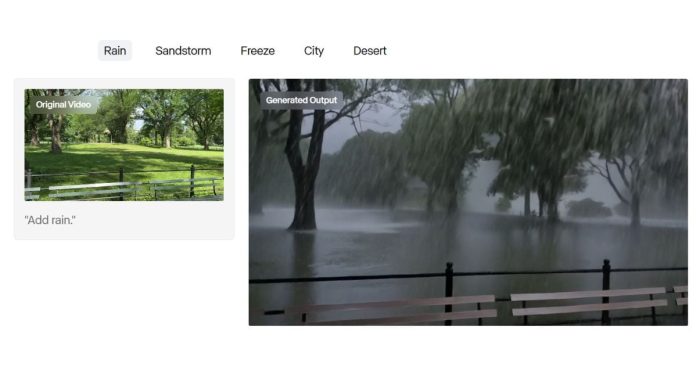 एआय व्हिडिओ मॉडेलची सर्वात प्रभावी क्षमता म्हणजे वातावरण, स्थाने, हंगाम आणि दिवसाची वेळ बदलणे. याचा अर्थ वापरकर्ते सनी सकाळी पार्कचा व्हिडिओ अपलोड करू शकतात आणि एआय मॉडेल पाऊस, वाळूचा वादळ, हिमवर्षाव प्रभाव जोडू शकतो किंवा रात्रीच्या वेळेसारखे दिसू शकतो. व्हिडिओच्या इतर सर्व घटकांप्रमाणे ठेवताना हे बदल केले जातात.